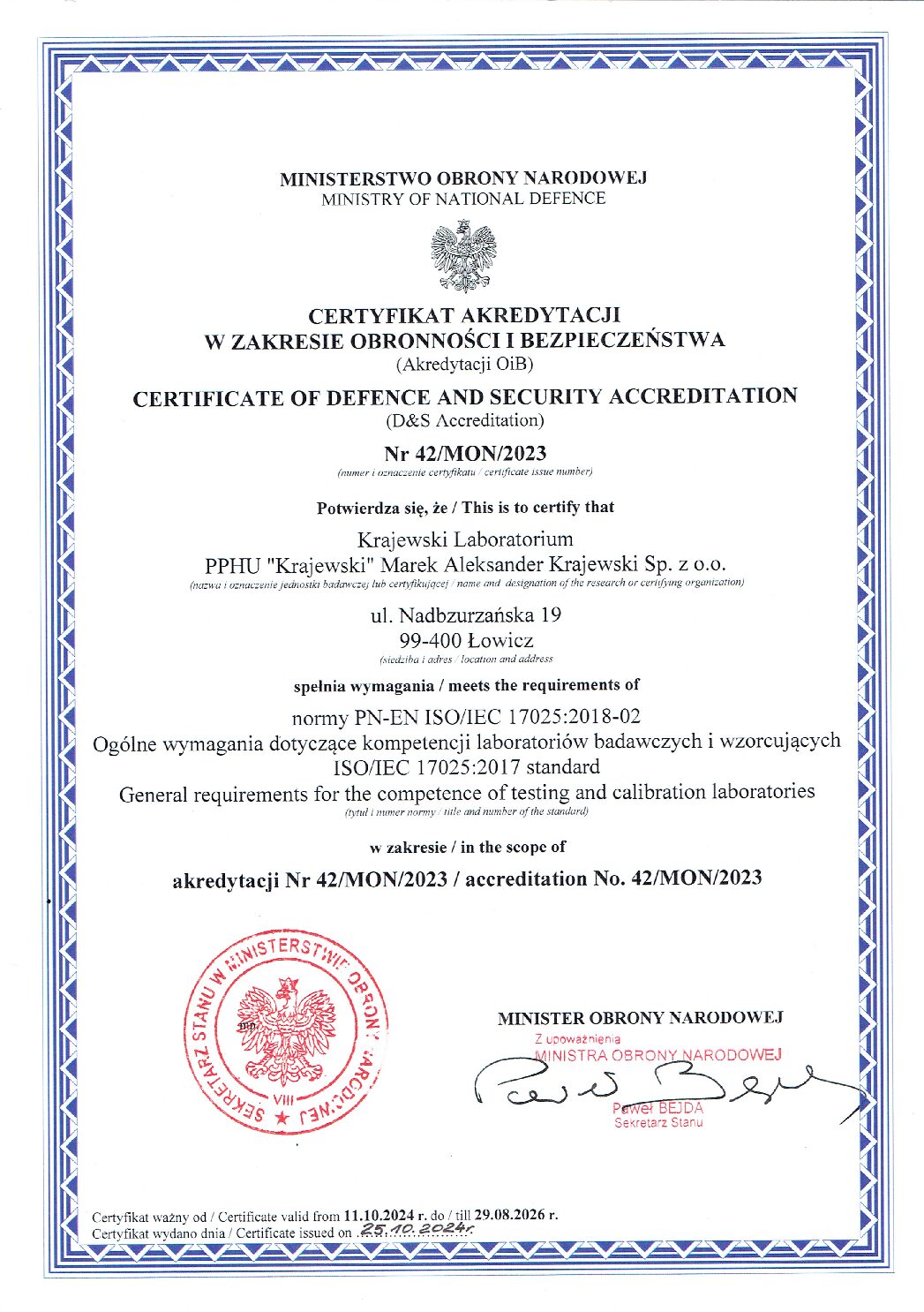 W 2014 roku otrzymaliśmy Certyfikat Akredytacji w zakresie obronności i bezpieczeństwa przyznany przez Ministerstwo Obrony Narodowej.