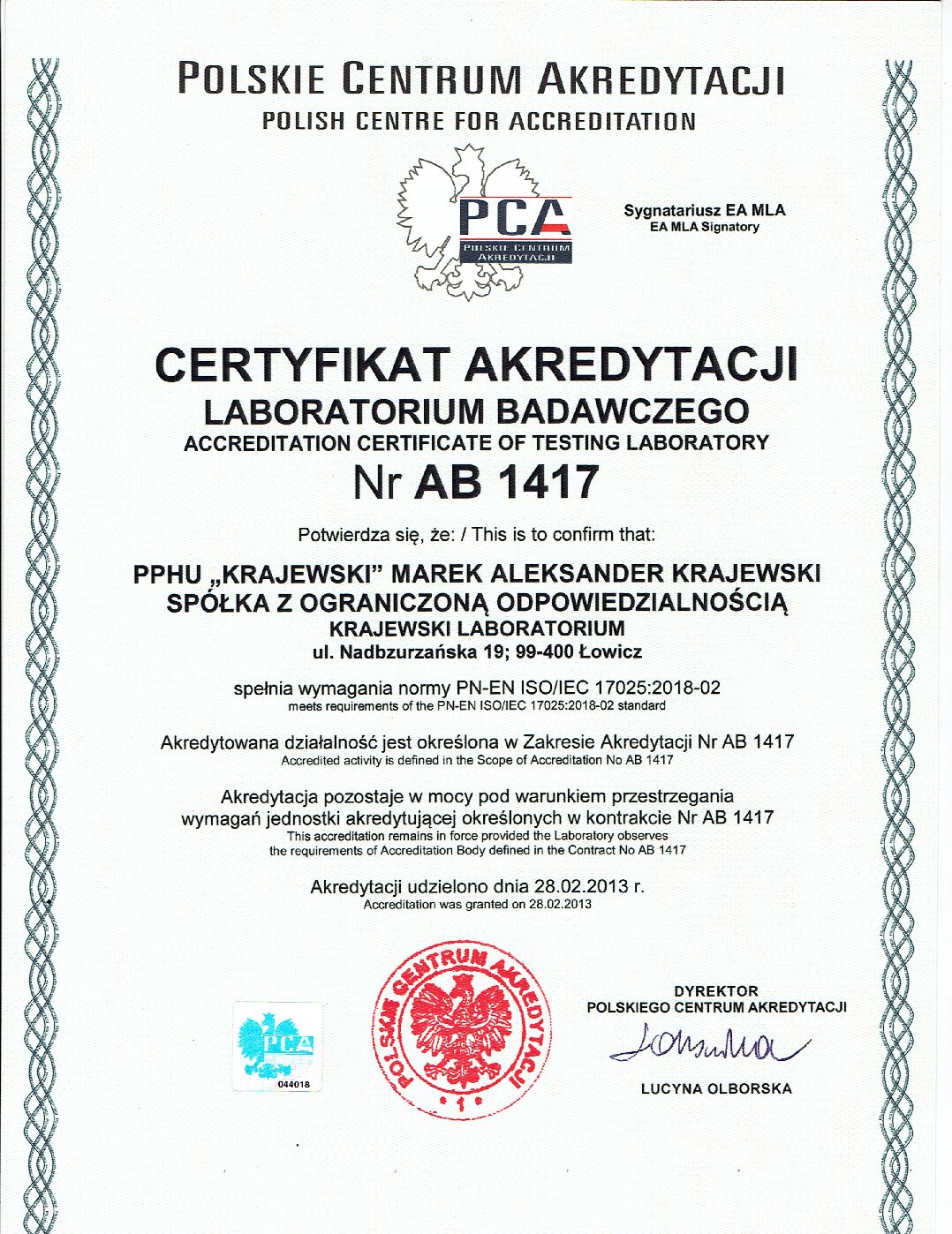 W 2013 roku otrzymaliśmy Certyfikat Akredytacji Laboratoriów Badawczych przyznanych przez Polskie Centrum Akredytacji Nr AB 1417 za zgodność z normą PN-EN ISO/IEC 17025.